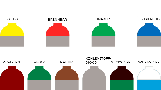 Die Farben signalisieren auch die unterschiedlichen Inhalte und Eigenschaften der Gasflaschen, um das Risiko einer falschen Anwendung zu minimieren.